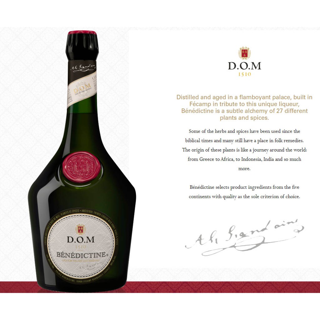 Dom was initially used for medicinal purposes but with medical advances it became more popular as an alcoholic drink and is. Flavoured with twenty seven flowers berries herbs roots and spices it was developed by wine merchant alexandre le grand in the 19th century and marketed as having been derived from an original recipe of benedictine monks of the abbey of fecamp in normandy lost in the ashes of the french revolution. 25ml benedictine dash orange bitters champagne add benedictine and bitters to champagne flute top with champagne and garnish with a lemon twist.