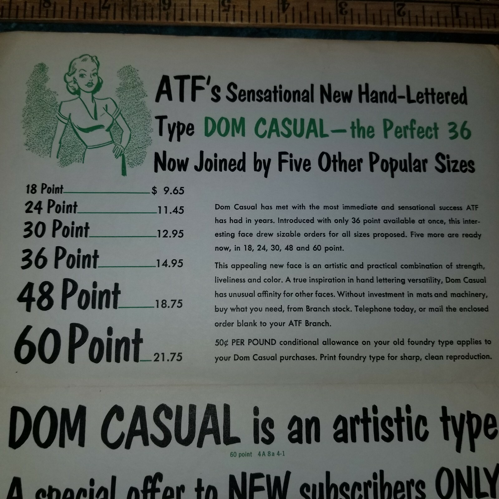 Dom casual is an informal script typeface that looks brushwritten. Use this typeface to create a friendly informal look in signs advertising and invitations. Dom casual was often seen in 1960s television programs such as nearly all warner bros.